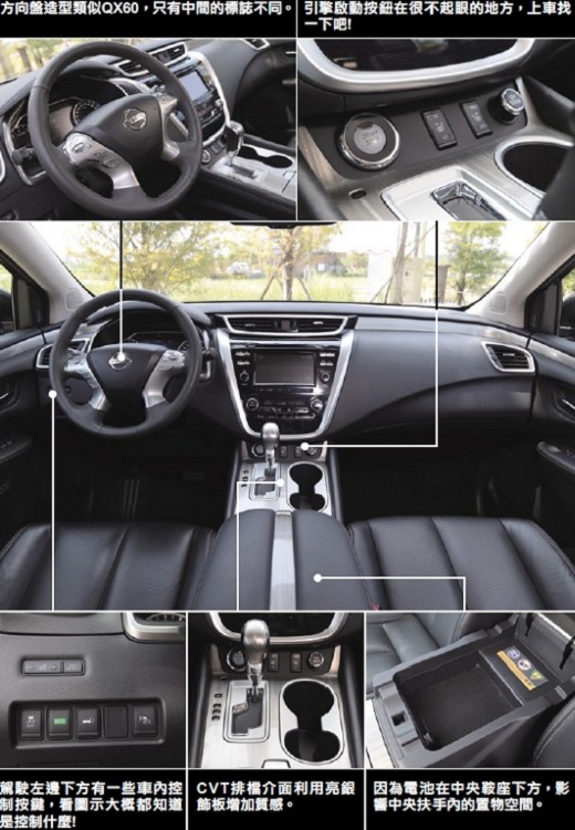 在這次試駕行前介紹中,原廠人員並沒有特別強調Murano的四輪驅動系統,上一代看的到4WD Lock鍵這帶被取消,這證明HYBRID動力雖然它擁有全時四輪驅動系統,在實質在試偏向都市化的SUV,少了Lock鍵不算是完全廢掉武功,一般路段為了省油會用前輪驅動,當後輪打滑時才會介入四輪驅動的模式,電腦暗中默默幫你做切換。那操控表現如何?整體懸吊底盤的搭配以舒適為出發點,找不到熱情的成分,路面的坑洞接近百分之百被懸吊給吸收,舒適的皮椅加上柔軟的懸吊襯托出優雅的行車個性。