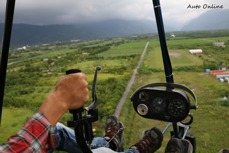 這裡提供有罩和開放式機型兩種選擇,前者就像縮小版的飛機,前方有裝設擋風,坐起來比較舒服,但我們想要體驗真正開放的感覺,當然是選擇無罩的機型。花東縱谷真的是很適合玩輕航機的地點,尤其這附近沒有高樓大廈和電線桿,氣流天候也很好觀測,至少讓作為乘客的我們,搭起來比較安心。跳進座椅綁上安全帶,加速沒幾秒就已經衝上天,除了聲音吵了點,過程卻是相當平穩。從速率計看來,飛行速度不到70km/h,和平時騎車差不多,雖然一開始腳底懸空的感覺還是會毛毛的,不過很快就知道要把握機會欣賞美景了。