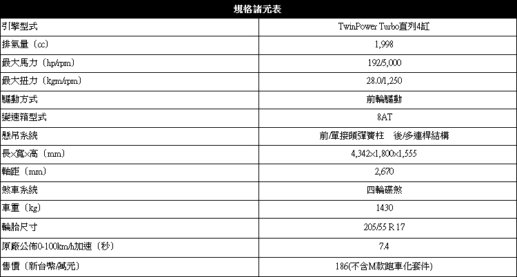 動力夠用加速破百只需7.4秒![]() ▲動力配置220i AT搭載一顆2.0升實際排氣量1,998cc的四缸渦輪增壓引擎。動力配置220i AT搭載一顆2.0升實際排氣量1,998cc的四缸渦輪增壓引擎,最大馬力192hp在轉速5000rpm爆發,低轉速1250rpm時扭力慢慢釋放,最大能創造出28kgm輸出值。使用相同引擎的225i AT,透過電腦調教上的不同,最大馬力達到231hp,最大扭力則有35.6kgm左右的輸出。變速箱為Steptronic運動化八速手自排,達到綿密的加速力道,靜止加速到百公里只需要7.4秒,這成績已經贏過多數的家庭房車,果然BMW對於樂趣不失它該有的格調。 ![]() ▲實際在道路上體驗,M款跑車化懸吊比起一般車型有較高的支撐性,這也代表喪失少部分舒適性。