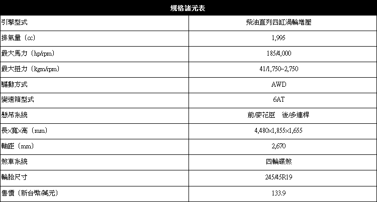 ▲動力編成上使用2.0升柴油引擎,最大馬力達185hp/4000rpm,最大扭力41kgm/1750-2750rpm。