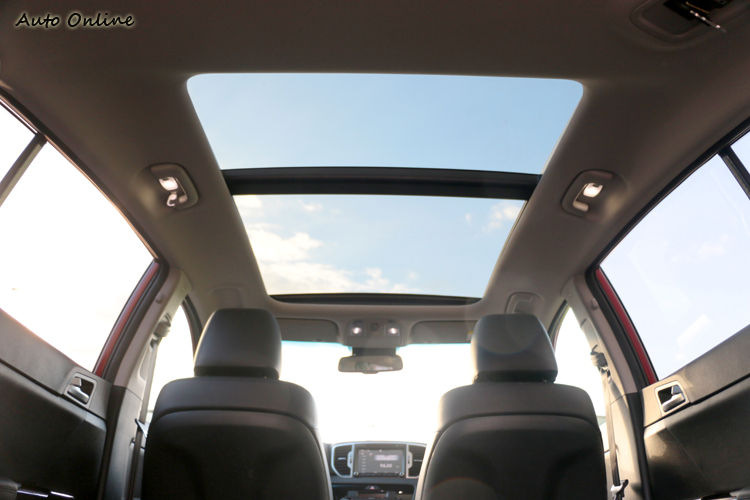 ▲全景天窗讓車內視覺開闊,降低後座乘客不可避免的壓迫感。