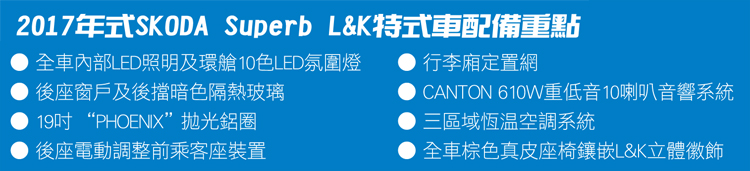 另外,SKODA Taiwan針對搭載280hp最大馬力輸出及全時四輪驅動設定的尊榮動力版車型,也就是這次的試駕車,贈送了價值超過30萬的L&K配備,等於是把許多選購配備都追加進來。其他包括其新設式樣車內電子自動防眩後視鏡、新排檔頭造型以及強化抗酸雨、防水效能的鍍鉻窗框等,也都是2017年式Superb的新增配備!