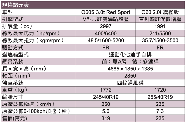 Q60 2.0t與Q60S 3.0t兩者有鮮明的產品定位,想要多點樂趣與激情,當然就是選擇大動力的3.0t車型,但你只是講求帥氣,對於性能沒有太大要求,2.0t則是不錯的選擇,何況兩者在外型、配備與安全性上差異性不大。售價上,2.0t有豪華版205萬元、旗艦版235萬元,3.0t只有一個規格Red Sport 319萬元,有點大的差距我想消費者能更快決定適合自己的Q60。這一次無法全面體驗到Q60市區走行所帶來的不一樣面向,有機會我們將會再與原廠商借,看看熱血賽道後,回歸正常會不會又有新的體驗。