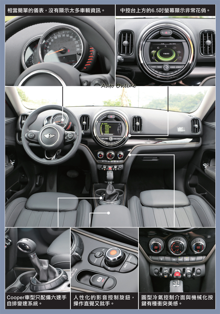 第二代MINI Countryman車型做了質感升級,中控台設計從上至下由三個水平層次堆疊而成,且以方型或直列線條取代以往大量的圓形元素。中控台上方的MINI Visual Boost 6.5吋繁體中文螢幕,用非常花俏的呈現方式,外圈還有光環能與車主即時互動。消費者可另外選配新世代8.8吋繁體中文螢幕升級觸控導航系統,採用全新ID5操作介面,功能性加強大。