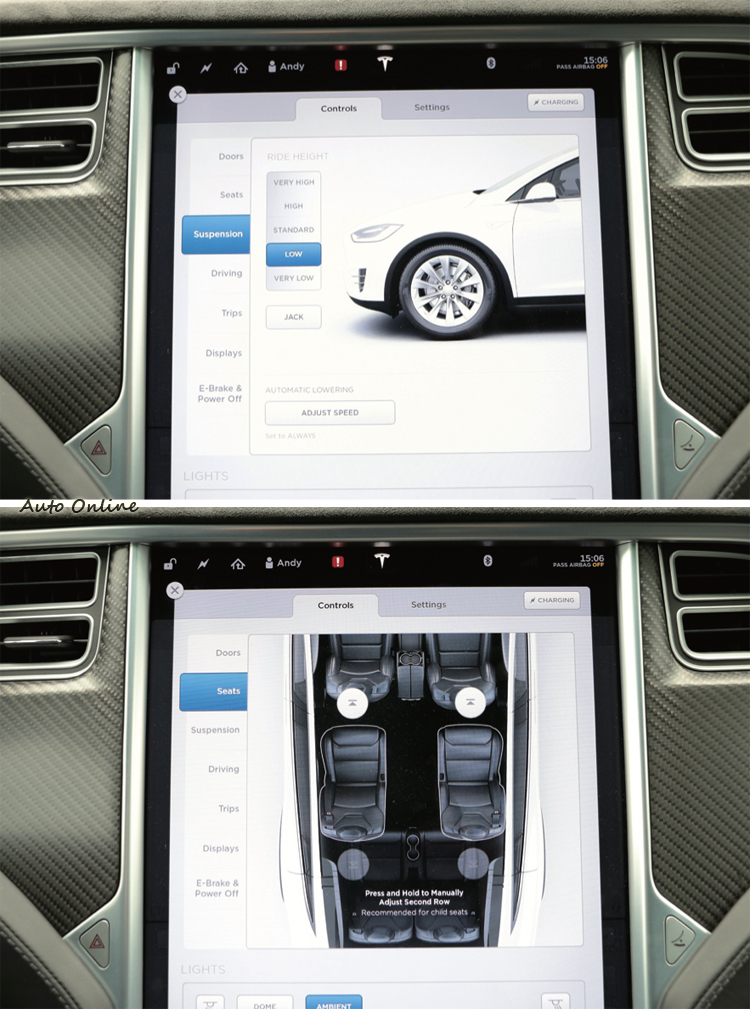 ![]() ▲TESLA積極增設充電站,就是要做到電動車與內燃機相同的便利。動力部分,Model X 90D配置電池規格90kwh,採前後兩組電動馬達構成四輪驅動系統,靜止加速到百公里只需要5.0秒,最高速度設定在250km/h,最大續航里成為489公里。如果是更高性能版本的P100D,靜止加速至100km/h僅需3.1秒。 ![]() ▲Model X避震器與路面回饋整體表現偏硬,細膩度有待加強。![]() ▲自動輔助駕駛電腦會自動偵測前方路況,主要障礙物可分為貨車、轎車與摩托車。