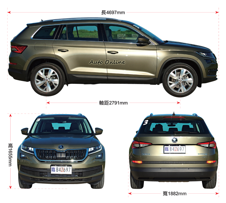 從身材比例上來看,Kodiaq的車頭短小,將大部分的車長留給車室/行李廂部分。A柱有將近45度的傾斜,在前擋風玻璃最上緣到達最高位置後向車尾小角度地低斜,車頂線條在粗壯的D柱處再大角度轉折形成車尾,從車窗輪廓看起來其實還更像旅行車。
