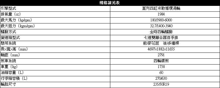 ▲所搭載的2.0TSI米勒循環渦輪引擎可輸出180hp馬力與32.7kgm扭力。