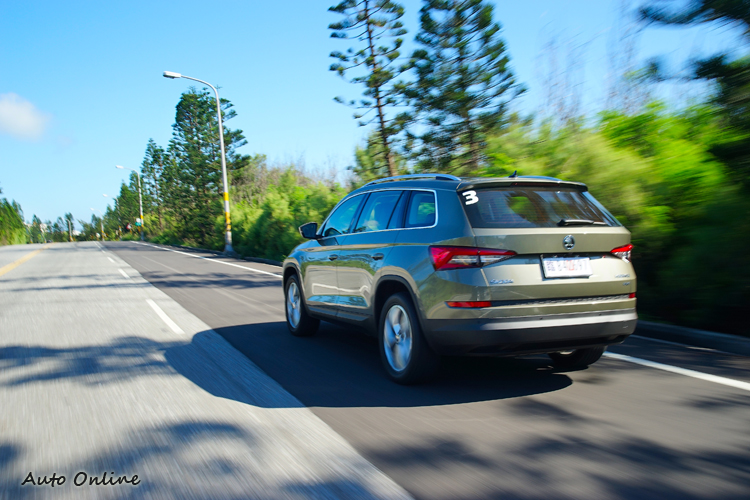 身為VW集團大家族的一員,Kodiaq自然也採用了集團的MQB模組化底盤,其前後懸吊分別為前麥花臣、後多連桿結構。行駛時給人很Q彈的避震感,經過路面較大高低起伏吸收掉大部分衝擊震動且不會有多餘的彈跳感,而經過路上常見的減速條時,震動則被吸收地只有細微感覺。加上隔音表現很佳,乘坐舒適性相當不錯,對車內乘客來說也是好消息。
