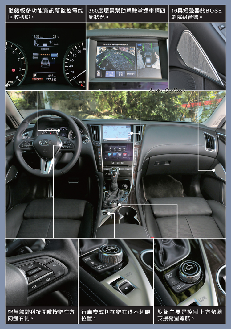 中控台影音、冷氣系統採雙螢幕設計,上方的螢幕主要提供微星導航與車外環景使用,使用方法可透過觸控或者中央鞍座上的旋鈕切換。下方的螢幕是主要是 INFINITI InTouch影音功能切換介面,從選單能調整冷氣、音響、行車模式等功能,主動安全防護也能從這螢幕分別獨立啟閉各項功能;另外,螢幕也能監控車輛狀態、旅行電腦等資訊。原廠在螢幕兩邊還是保留實體按鍵,因為在某些環境下實體按鍵控制還是比較方便。新年式新增車內氣氛燈與升級16具揚聲器的BOSE劇院級音響,跑格與豪華兩種氛圍結合為一。