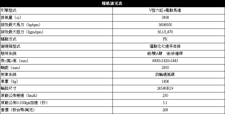 Power Hybrid性能油電混合系統在引擎與變速箱之間安裝電動馬達,透過馬達前方的乾式離合器與變速箱後方的濕式離合器,有效切換馬達與引擎出力選擇,雙離合器的動力傳遞,能呈現直接與快速的加速表現。這顆電動馬達可提供電池充電,也能提供額外動力輸出,它的作動時機完全由電腦控制,所以在車內看不到任何EV按鈕。電腦監控到電池電量充足就會轉用電動馬達行駛,純電行駛最高速限達到一百多公里。電動馬達輸出方面,F1賽車上對於馬達占比只有35%,協助引擎扭力可有203Nm,反觀市售車高達45%,扭力輸出有290Nm,Power Hybrid完美呈現。