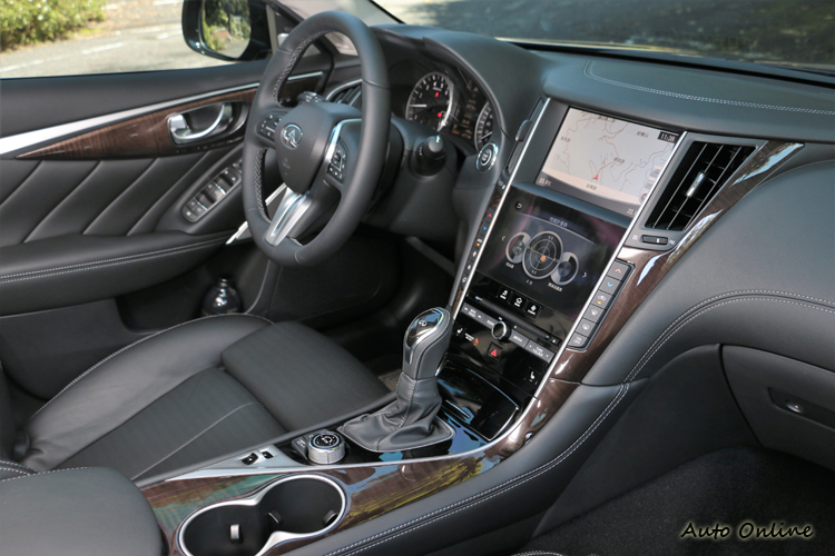 ▲換上與Q60相同造型的方向盤與排檔桿,中控台為雙螢幕設計。