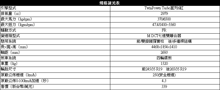 動力與底盤展現均衡搭配![]() ▲在超增壓模式下,扭力更可以短暫瞬間達到50.9kgm最大扭力。介紹完不是很重要的外觀與內裝後,進入重頭戲當然就是它的駕駛樂趣。切入操駕感受前,當然要先說說它的動力元件;渦輪化後的BMW,使M2只需要一顆3.0升直列六缸的渦輪增壓引擎就能創造出絕佳的樂趣。引擎結合進、排氣可變汽門與可變汽門揚程輔佐下,創造出370hp/6500rpm的最大馬力及47.4kgm/1400~5560rpm的最大扭力,在超增壓模式下,扭力更可以短暫瞬間達到50.9kgm最大扭力。搭配選配的七速M DCT雙離合器自手排變速箱與起步控制功能之下,0-100km/h加速成績可跑到4.3秒,極速則被電子限速於250km/h。七速M DCT變速箱搭載Drivelogic換檔邏輯系統,有跑車風格、舒適與效率三種,讓換檔速度更加飛快同時確保動力銜接的平順。另外可選用M Driver’s Package最高時速可提升至270公里,解放內心的狂野發揮極致。 ![]() ▲短小的軸距以及強化的底盤,堪稱是M款車系中最有樂趣的。印象中的M-Power車款是自然進氣、高轉速素、大馬力,在渦輪化的影響下,這些都已不復見。維持經典直列六缸搭配渦輪增壓,創造出超過三百匹馬力的數據是全新M-Power的體驗。老實說換上渦輪後我覺得動力更好控制,不需要等到高轉速馬力就能乍現,配置的渦輪口徑不大,原廠調校線性,沒有渦輪遲滯也沒有不受控的動力湧現,整體起來容易上手。當戰場轉換到多灣的山道,油門的拿捏就需細膩,在一般Normal模式下,突如其來的大腳油門還是會造成車尾晃動,失控前DSC會將車輛救回。 膽子大、技術好,強烈建議切換到Sport+模式,油門、變速箱進入備戰狀態。DSC容許一定範圍的車尾滑動,運動化懸吊結合輕量化車身與絕佳配重,山道上的靈活性是眾多M款車系中最佳。山道上車尾緊跟著車頭丟進彎中,膽識夠大多踩一些油門,車尾瞬間帶出幫助車頭轉向,但只要不長按DSC按鍵,就不會完全關閉,瀕臨失控時電腦會介入穩定車身。真想嘗試甩尾過彎,完全關閉DSC後在主動式後差速器輔佐下,華麗的甩尾過彎不是難事,前提你的技術要好,天堂與地獄就在一瞬間。
