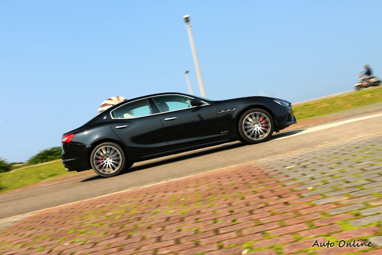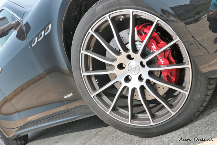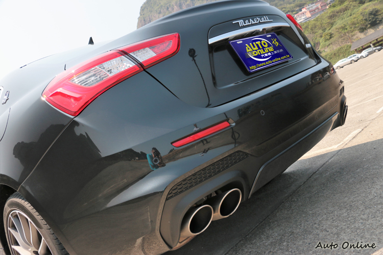 GranSport車型更有型![]() ▲Maserati A6 GCS以及 Alfieri概念跑車的水箱格柵,中間安置三叉戟廠徽帶來狂傲又高貴氣息。新年式Ghibli導入GranSport車型,外觀上做了小小改變,從車頭看去最吸引人之處為Maserati A6 GCS以及 Alfieri概念跑車的水箱格柵,中間安置三叉戟廠徽帶來狂傲又高貴氣息。下方的進氣壩考量到空氣力學,調整樣貌後與改款前相比優化7%來到0.29 Cd,個人覺得改款後的前臉運動氛圍加重,更符合Ghibli該有的樣子。全新LED頭燈組照明度提升20%,照明距離達到200公尺,增加安全性也比起HID與傳統鹵素燈泡更高耐用度。 ![]() ▲Maserati品牌散發著高品味、低調的特質,完美詮釋在新年式Ghibli身上。![]() ▲試駕車款選配20吋放射造型鋁圈,鋁圈內部則有亮紅Brembo煞車卡鉗。![]() ▲保桿做出更立體的線條來搭配左右雙出排氣管,排氣管有主動式閥門,運動模式下能創造出高亢聲浪營造聽覺饗宴。