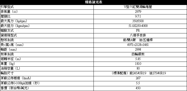 動力調漲,樂趣至上![]() ▲試駕車為GranSport車型,使用與S Q4相同引擎輸出則有350hp最大馬力與最大扭力51.0kgm。台灣所販售的Ghibli共有汽、柴油兩種動力,汽油部分又有兩種規格,高性能版本為S Q4,搭載一顆與法拉利共同研發的3.0升V6雙渦輪增壓引擎,最高馬力達到430hp與59.2kgm最大扭力。試駕車為GranSport車型,使用相同引擎輸出則有350hp最大馬力與最大扭力51.0kgm。兩種動力版本同時都搭配MASERATI Active Sound主動式聲浪,主動式聲浪更是由義大利聲樂家耗時5000個小時以上的時間鑽研調教而成,宛如天籟之音,渾然天成,並藉由內建在兩側排氣尾管內的真空閥門以及獨家聲音技術,營造出不容錯認與魅力絕佳的獨特音頻。按下Sport模式按鍵後,引擎反應、MSP介入控制、換檔速度與排氣閥門都會同步改變。 ![]() ▲變速箱為八速手自排變速箱配置,齒比銜接綿密,靜止加速到100km/h只需5.5秒,極速設定在267km/h。![]() ▲選配先進駕駛輔助系統包含了自動跟車系統。
