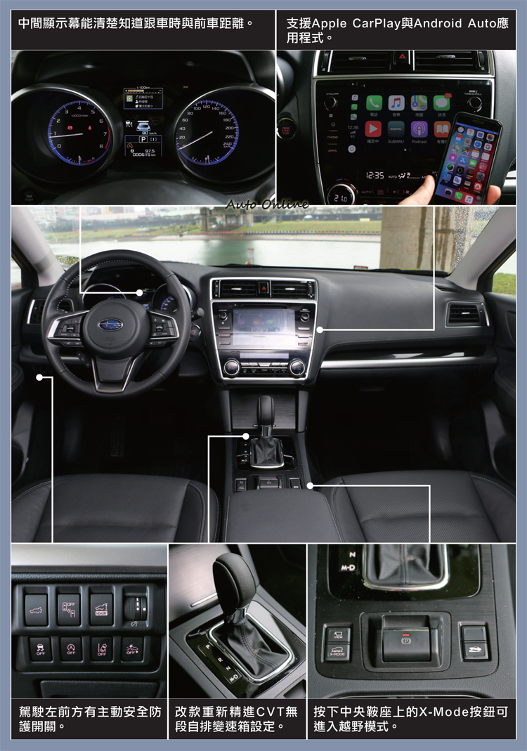 小改款後的Outback最大重點其實是Eyesight主動安全系統,透過前檔風玻璃上方的雙鏡頭能清楚辨別前方狀態,功能包含:在台北市交通狀態實際下測試,Eyesight能精準的保持與前車距離,當前方減速或者停止,電腦都能控制緩慢且精準的停下,輔佐駕駛無意間的錯誤。這套系統會介入制動系統但不會介入轉向系統,也就是可預防前方的碰撞,但是在高速公路上車偏移或者車道偏擺都只有警示,電腦不會介入方向盤來轉向。在這也要呼籲消費者,豐富的主動安全只是輔佐駕駛者,駕駛者還是要專心的注意前方路況,畢竟還正式進入自動駕駛時代,開車的責任還是在駕駛身上,主動安全防護也只站在協助的角色。