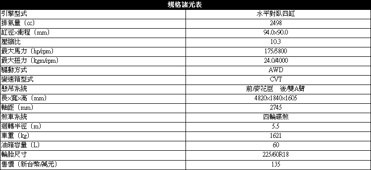 ▲搭載代號FB25的2.5升水平對臥四缸引擎,擁有最大馬力175hp和最大扭力24kgm。