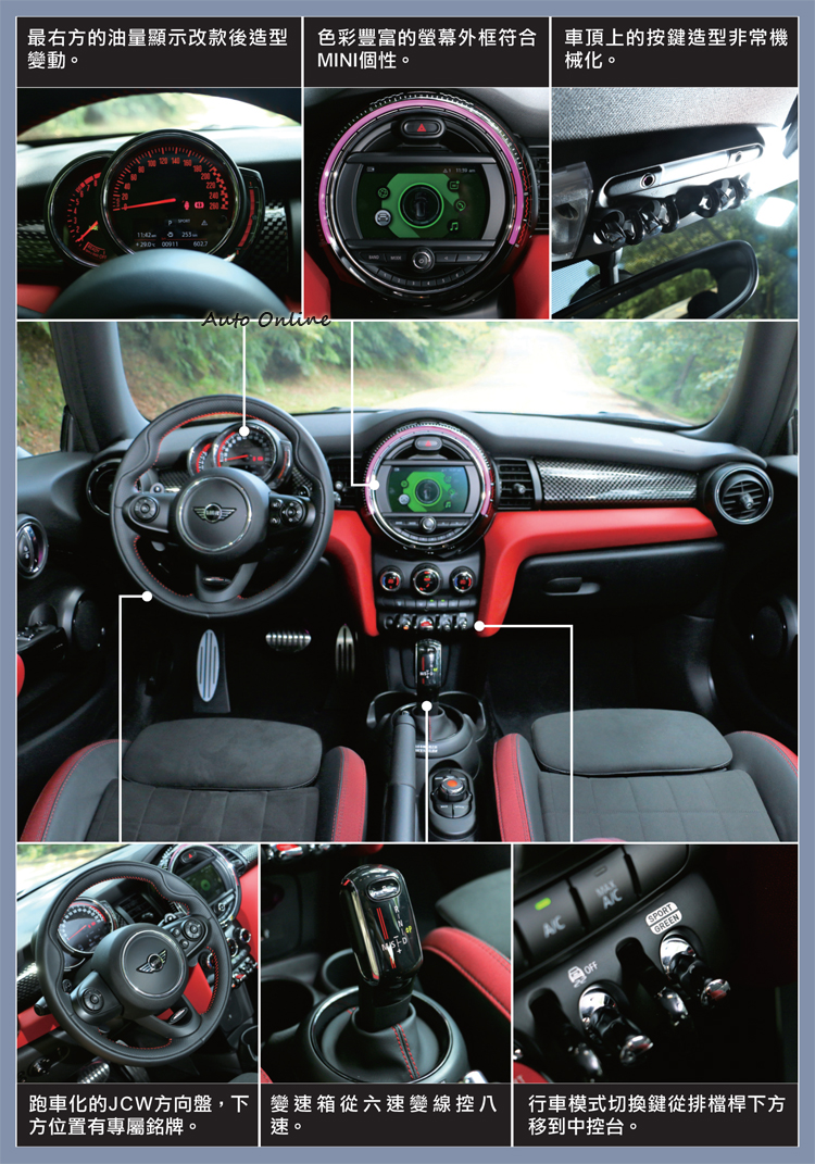 帶來如同卡丁車般駕駛樂趣![]() ▲想買MINI不分年齡、職業、性別,只要是對於自己的生活充滿無限遐想,絕對會對MINI有點動心。這樣做會不會降低它該有的樂趣,我給你肯定的答案「不會」。小改款前的六速變速箱改為八速後,檔位可使用的範圍更加寬裕,低速加強它的輕快性,高速則能維持較低的轉速帶來節能,檔位銜接恰到好處且感受明顯。排入D檔輕踩油門出發,MINI JCW沒有什麼脾氣,不會讓人覺得不好親近;市區行駛明顯感受硬朗避震器,加上205/40R18的低扁平比輪胎,車身有點彈跳,就算試駕車有選配動態避震器控制系統,在Mid一般模式還是非常明顯。