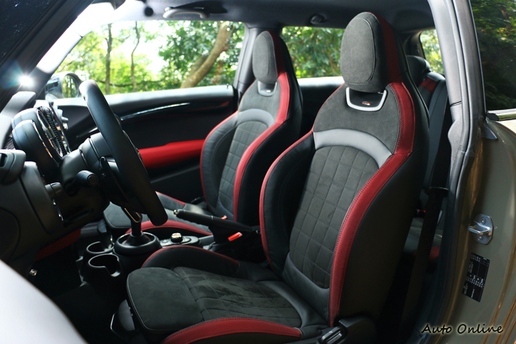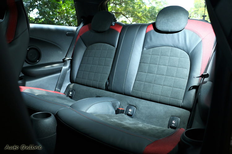 ![]() ▲半皮半麂皮包覆搭配上左右支撐性,能抵抗G值造成的身體滑動。![]() ▲後座只能容納小朋友的體型,大人可別輕易嘗試。![]() ▲車內到處可看見原廠對於MINI JCW的用心。![]() ▲打開車門最先看到的是JCW專屬門飾板。