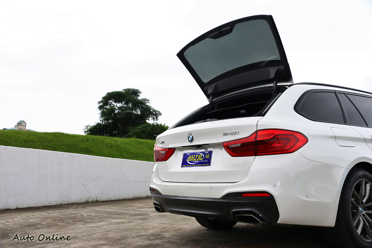 540i Touring外觀搭載M Sport運動化套件,家族化的雙腎形水箱護罩內有主動式進氣葉片,需要散熱的時候打開,不需要關閉減低風阻。標準配備LED頭燈結合轉向頭燈與遠光燈輔助,另外還有LED日間行車燈與前霧燈,搭配少量鍍鉻飾條的M Sport前保桿,創造出運動的前臉造型。車尾L型LED導光條尾燈設計簡單俐落,令人難以錯認這帥氣背影。排氣尾管採用雙邊對稱設計,造型上雙邊矩形尾管設計。
