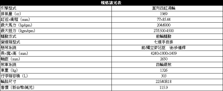 前方控台分別在多媒體按鍵區與副手座前方採用碳纖維紋路與霧面塑料飾板點綴,加上按鍵區、排檔桿、方向盤、座椅這些地方的紅色線條在黑色調內裝之中做些對比的凸顯。駕駛座前方的雙筒式儀錶板也很中規中矩,只是多了紅色外圈來與車上其他紅色飾條相呼應。