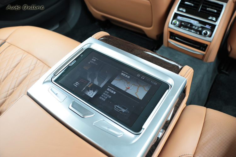 長軸車型標準配備7吋後座專屬控制平板(Touch Command),可供後座乘客調整座椅角度、空調、遮陽簾、影音設備等超過20項功能。另外,試駕車款選配了後座影音系統,包含雙10吋觸控螢幕可獨立調整音樂、導航等功能,大老闆們沉浸於後座私人空間,享受有如飛機頭等艙的享受。