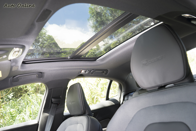 座椅是R-Design車型專屬的Nappa透氣真皮搭配內側的運動織布,內側採用運動織布的理由是為了增加摩擦力,讓駕駛/乘客在激烈操駕下身體有較好的固定性。雙前座提供多向電動調整(包含背部支撐調整)與腰靠電動四向調整,還有腿部延伸支撐調整,不管你腿長還是腿短都可以得到適當的支撐。新S60從T5 R-Design以上車型都標配全景電動天窗,給車室良好的採光。