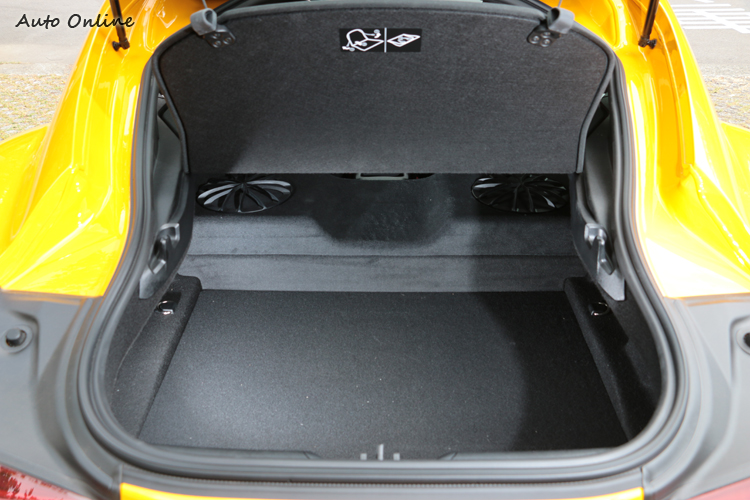 設定為雙座跑車,所以後方只有精巧的置物空間,可以放置一些私人物品。另外,你還可以看到兩只JBL超大揚聲器,小小的座艙中打造出完美音場,當你聽膩排氣管聲浪,也能選擇享受在美妙音樂之中。後行李廂的空間不用有過多期待,可放進兩人出遊行李以及老闆們心愛的高爾夫球具,如果還想要再放進更多,那就請你的副駕駛抱著幫你好好保管。