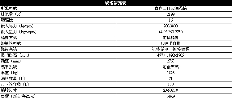 ▲2.2升CRDi柴油引擎馬力與扭力為200hp/44.9kgm。