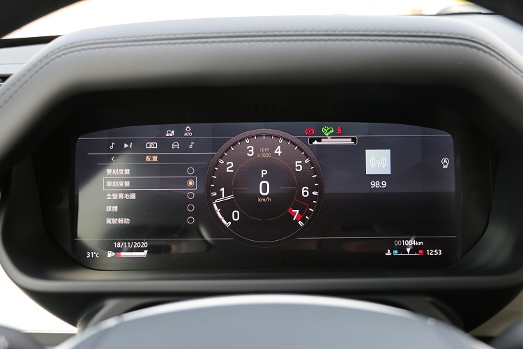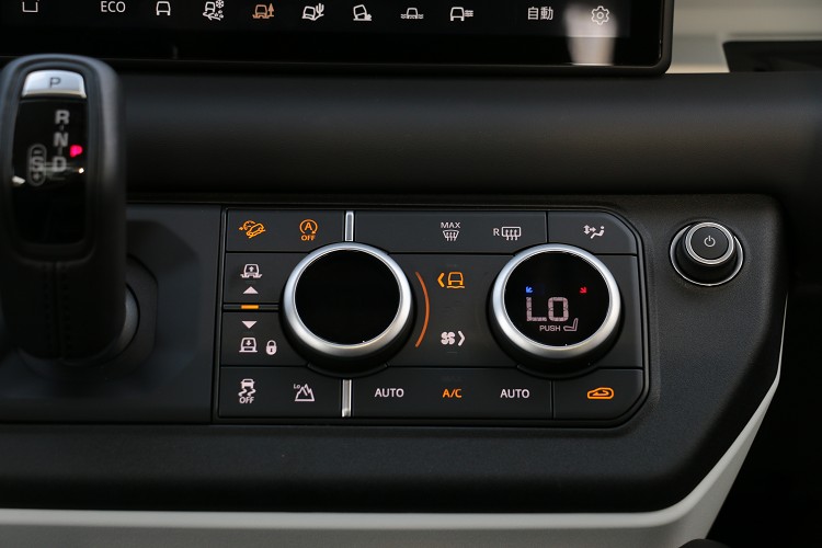 中控台由一個10吋多媒體觸控式螢幕與儀表板12.3吋全數位化螢幕建構出科技感,車輛資訊都能由這兩個屏幕上取得,使用上非常方便與直覺。中間螢幕的下方是全車精華處,除了排檔桿之外,冷氣介面以及Terrain Response 2 第二代全地形反應系統都由這兩顆旋鈕操作,搭配上方螢幕圖示,可快速選擇所需要的越野模式。