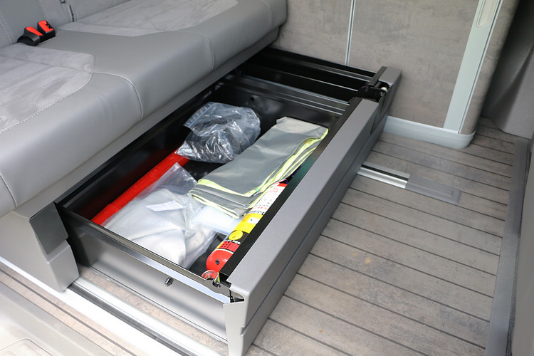 ▲座椅下方的大型抽屜是最方便取放雜物的收納處,因此滅火器就固定在此處。