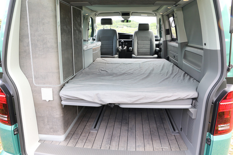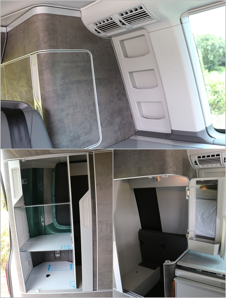 這款California Ocean另一個看點就是它配備了電動車頂帳,按個鈕就能夠掀起或收折車頂,前方天窗還具有半圓形開口與全開兩種開啟方式,也有防止孩童掉落的安全網;帳頂提供可獨立開關與調整明亮的照明燈,床組更把T6的松木床架升級鋪上新設計的蝶形彈簧搭配舒適床墊,不愧是號稱豪宅等級的露營車。