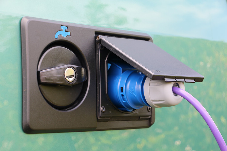 從車外說起,在右側滑門上方外掛的是一組伸縮式遮陽蓬,使用T型轉桿將它展開後就是一具天幕帳,即使單人操作也很容易,搭建後並不會妨礙側滑門作動。車身左側可以看到外接電源插座,可接受110V-230V的電壓,不過是歐規型式;這是用來為車內第二、第三電瓶蓄電的設備,插電後,冰箱、冷暖氣或是廚房中島前方的插座即使不用發動引擎也能使用。