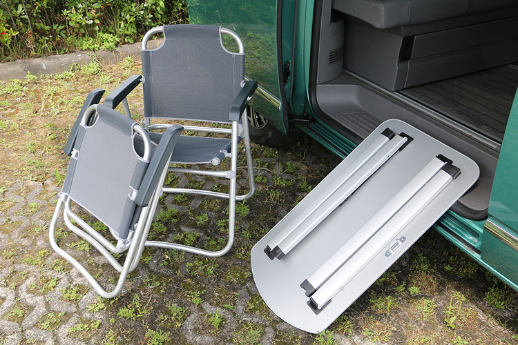 位於側滑門內部則收藏了一組隱藏式鋁合金折疊桌,我們發現它不需額外的機構就能牢牢地固定在車門內部,不但節省空間,而且試駕一整天下來也也沒有出現任何震動噪音的問題。有桌子當然少不了椅子,打開後尾門內的拉鍊布袋,裡面就有兩組折疊椅,和折疊桌同樣都是採用鋁合金材質,關節支點的穩定性還很不錯。