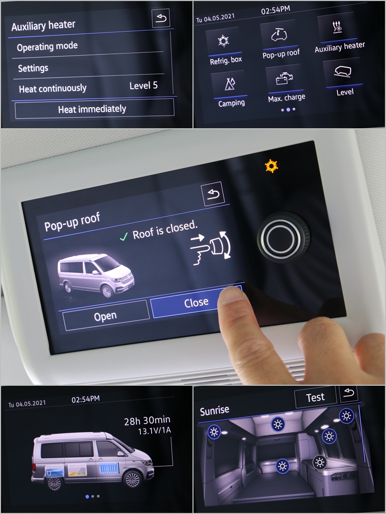 這款露營車最重要的操控核心,應該是後視鏡上方專屬配備的多功能中央控制面板,在改款後將原本的黑白界面升級成觸控式彩色螢幕,還增加不少圖像化的選單,使用時只需要動動手指就能操控車頂帳伸縮、車內燈光、駐車冷暖氣;至於其他像是電力供應、儲水、及車身水平狀態等資訊,也會直接顯示在螢幕上,對於露友們來說是很便利的設計。