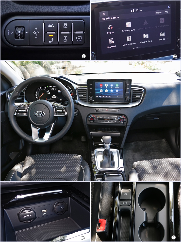 ▲(1)左下方設置了車輛安全及控制功能,按鍵造型及裝飾都不馬虎。(2)8吋全彩觸控螢幕支援手機連結,但可惜選單沒有中文化。(3)車內提供多座供電插槽,作為行動裝置或電器充電與電力來源。(4)電子手煞車讓鞍座空間利用率更好,雜物不怕無容身之地。