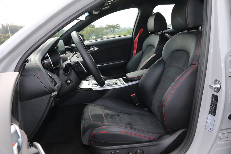 3.3 GT AWD有兩種座椅配置可以選擇,譬如試駕車就是配備「爍黑跑格化套件」,黑色椅面以所謂的鎖鏈區塊設計達到更好的支撐與舒適效果,而且前後座都導入紅色縫線、紅色滾邊和麂皮包覆,全車五人都採用紅色安全帶。