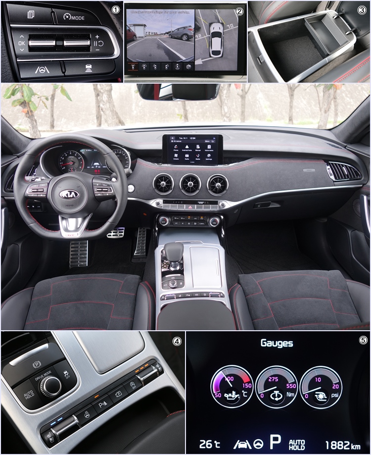 ▲(1)方向盤上的駕駛輔助控制鍵設計就手,皮面包覆也相當高檔。(2)SVM環景輔助系統在停車時提供了精準直覺的車輛定位。(3)定位為高級車的Stinger,車內多處儲物空間都設置了減噪處理的隔層或植絨。(4)方向盤加熱和座椅通風、加熱功能都是這款車的標準配備。(5)儀錶內提供了油溫、扭力和增壓值的數位錶盤供參考。