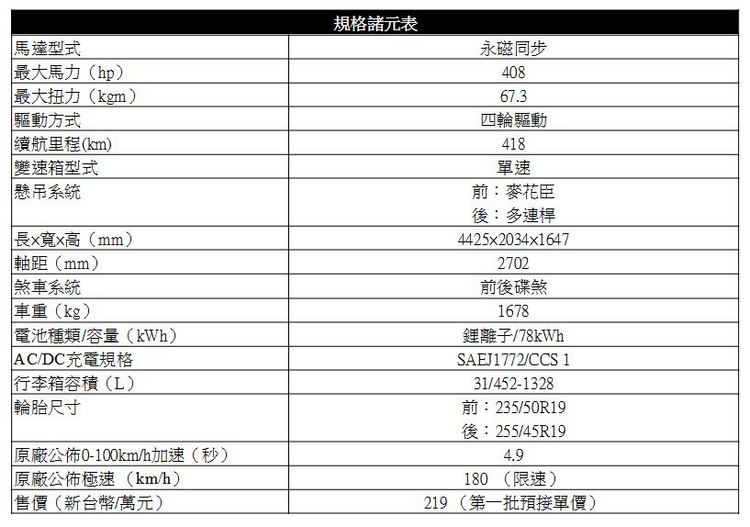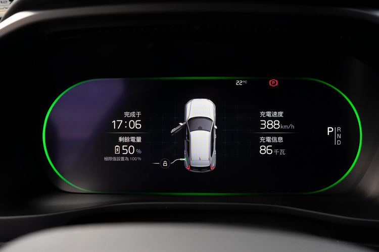 電池部分搭載由27個串聯電池模組(每個模組由12個電池芯組成)所構成的鋰電池,在配置上也避開了置腳的位置,後座乘客的腿因此不會被抬高而影響舒適。電池的蓄電容量為78kWh,在WLTP測試規範下的續航里程數據是418km。 因為續航里程是400km等級,車廠也特別安排了從台北至台南的試駕行程。從民權大橋旁的新凱展間規劃至台南桂田酒店約3小時18分鐘的路程Google Map預估到達時電量會只剩6%。不過我們當然不會就這樣直奔飯店,先順順開不頻繁超車的狀態下來到台中並到審計新村與中央公園拍照後再去台中公益路上的上立汽車充電,此時從飽電狀態用到剩下44%。經過半小時的DC快充後來到82%。再以頻頻大腳油門的方式花一個半小時左右開到台南桂田,此時電量剩下36%。
