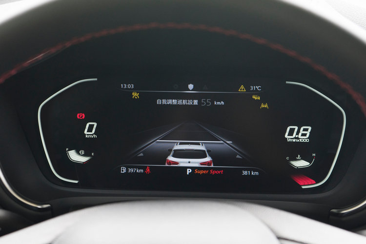 系統提供Supersport、Sport、Normal與Eco、Custom五種駕駛模式,影響層面包含引擎反應、方向盤重手度與數位儀錶的畫面風格。不過說起來Sport模式的引擎反應差異與Normal並不大,甚至是名頭聽起來響亮的「Super Sport」模式所帶來的動力輸出反應積極性也只是多出一點。煞車部分,前段行程的制動力道較弱,若能多些會更好。總結一下,這樣的動力輸出屬性可以讓人開得很輕鬆,但不會開得很「熱血」。