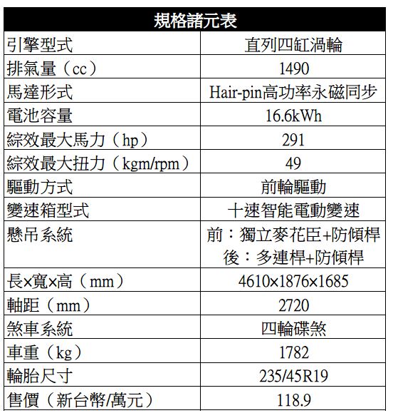 ▲搭載的PHEV系統由1.5T渦輪引擎搭配122kW輸出電動馬達所組成。
