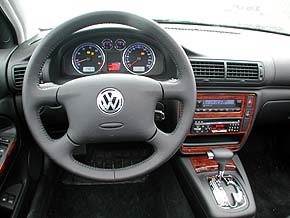 Passat 2.3 V5車款的內裝並沒有特別的新設定,依然是黑色內裝為底,搭配胡桃木紋飾板,皮椅及真皮方向盤質感細緻,中控台造型仍是一貫的方正品味,看起來紮實,所有操作旋鈕、按鍵也是剛硬派,沒有鬆散的脆弱感。為了增進質感,儀錶板增加鍍鉻環狀外框,配備也向上升級,雨滴感應式雨刷、防眩後視鏡、恆溫空調、防盜音響、行車電腦、電動天窗等通通有。看樣子Passat確實有以往AUDI A4的架勢,在動力、外觀、配備、質感整體升級後,搭配原有的硬底子車體及懸吊系統,不失百萬名車的氣勢。