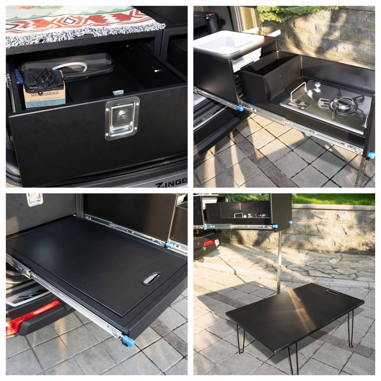 為了強化新Zinger在滿足露營、車宿這方面的產品力訴求,中華汽車特別與VAN BOX合作量身打造專用的活動式露營組,露營組內包含兩張鋁合金+鋼板+不鏽鋼材質的車床,只要在上面加個露營床墊就可以睡在上面(筆者個人會傾向直接睡在椅背放平的座椅上),床體下方有抽屜可以置物,還有一個抽屜式的工作檯面讓你放置物品,這個檯面拆下來後還可以變成折疊桌來使用。