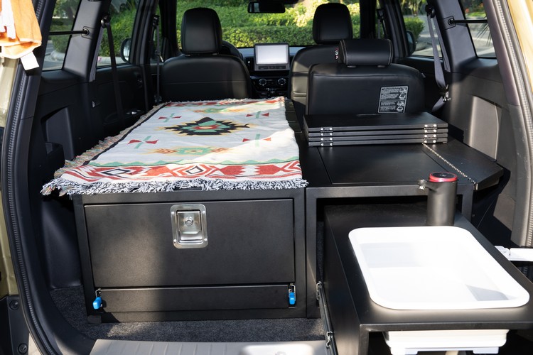 套件組中還包括了折疊盆搭配抽水器的洗手台方便沖洗,料理台可以放置任何廠牌的卡式爐,旁邊還有調料櫃可以放置調料罐與餐具,方便在戶外料理食物。套件組的安裝不影響車體,第二排座椅可以正常使用,也沒有驗車問題。選配還贈送1.折疊水盆、2.抽水器(USB充電)、3.三米軟管、4.沈水頭、5.ins波希米亞風毛毯、6.折疊垃圾架、7.餐巾紙吊架布。