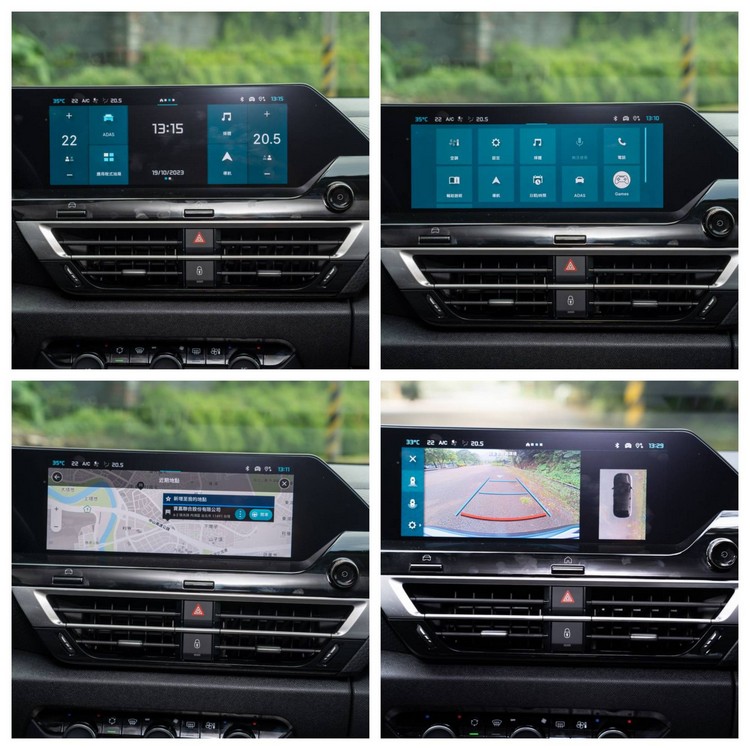 中控台上配置10吋全彩觸控影音資訊螢幕,有繁體中文顯示,可顯示的項目包括空調、電話、ADAS、多媒體播放、衛星導航等功能與設定調整,也支援有線/無線雙模式的智慧手機Apple Carplay / Android Auto連結操作。長方形的畫面便於分割顯示不同資訊。內建的衛星導航系統雖然同樣有繁體中文顯示,但是導航語音仍然是英文的女聲,不僅播報的路名難聽懂,語音的指示也多有延遲不清楚,所以上路後使用沒幾分鐘就放棄。