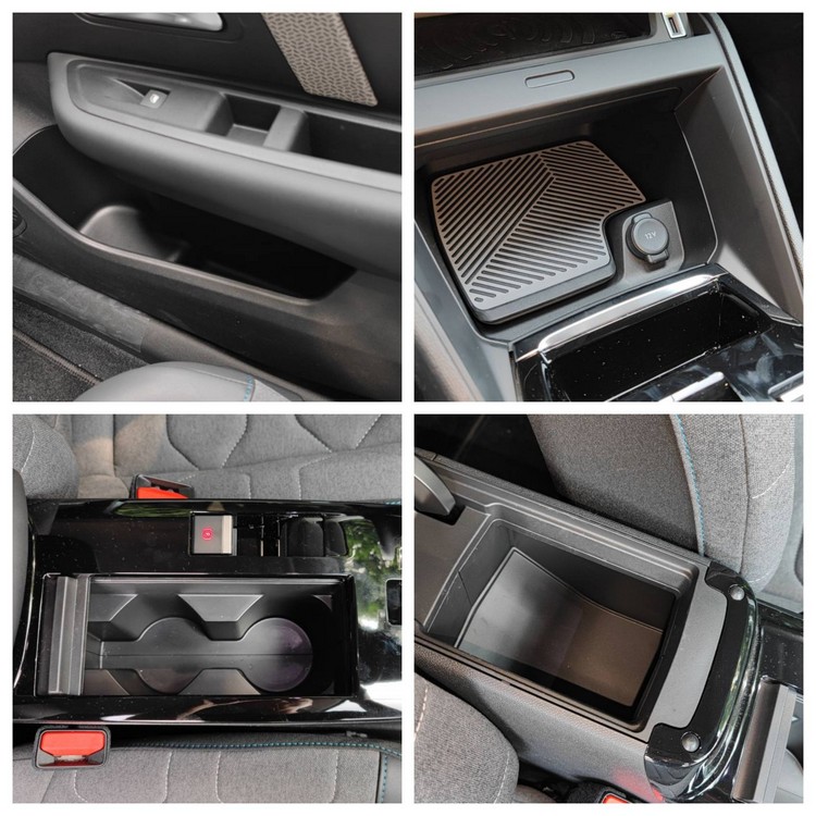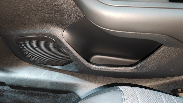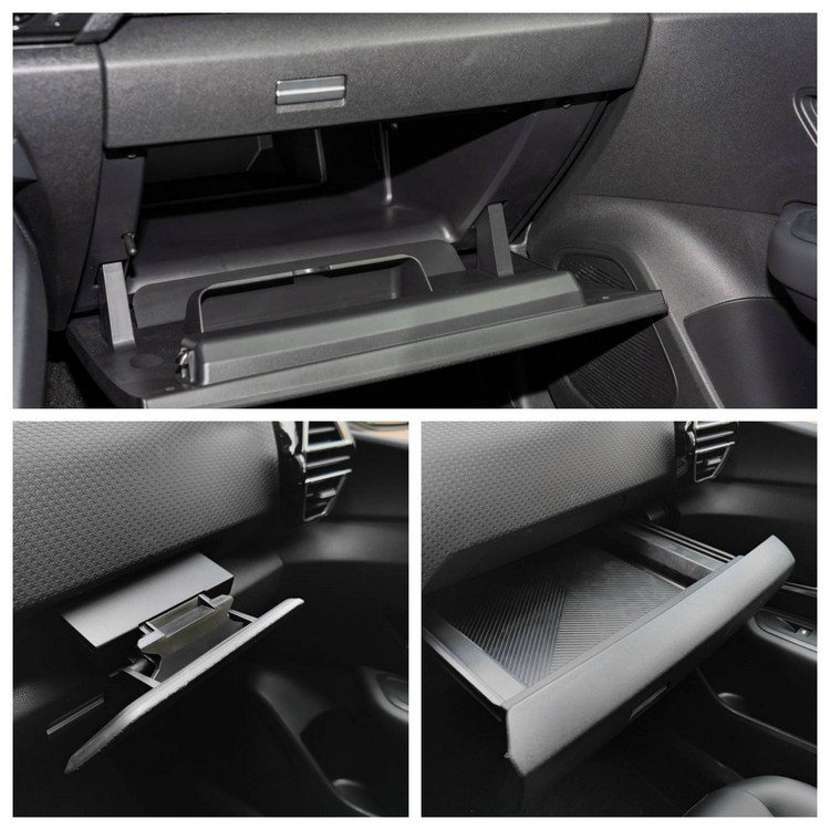 車內採用了多種不同的表面處理和用料搭配(包括鍍鉻和黑色烤漆飾板),讓以硬質塑料為主的內裝質感看起來更高檔些。在副手座手套箱上方有兩個特別的設計,一個是彈出式的平板底座,可以將選配的平板護套安裝在上面作為平板支架,副手座乘客便可空出雙手來觀看平板電腦螢幕。該護套也有防窺視功能,從旁邊的角度就看不清楚平板螢幕畫面。另外一個則是抽屜式的收納托盤,可以放些平面物體或小雜物,一些小物品放在手套箱有時會比較難找,放在這個托盤會更方便取用。至於手套箱本身看似不大其實內部空間還蠻深的,折疊傘應該都放得進去。