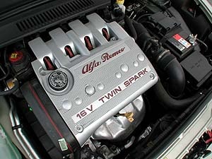 這顆2.0高轉速引擎絕非舒適取向,它天生就是要拉轉速用的。可變進氣岐管機構,轉速上三千後會明顯感受到引擎進氣聲浪轉為高亢,中高轉速表現優異,附加亢奮的排氣聲。雖然147的0-100km/h加速並不優異,但駕馭樂趣絕對不下於AUDI A3 1.8T,雖然兩者有背道而馳的引擎設計,也有截然不同的加速快感,渦輪引擎擁有猛爆的扭力,但高轉速引擎有模擬駕駛F1賽車的視覺快感(看著轉速錶一直攀升)及獨特的音場感受(越來越尖銳的排氣聲浪)。幸好147有五前速變速箱,不然高轉速引擎在山路上絕對會遇到很大的障礙。