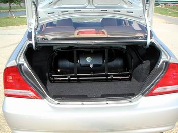 ▲置於後行李箱的LPG槽,國家認證相當安全,其上並附有存量指示表。據台朔汽車表示,LPG車除了燃料成本低廉與環保的優點之外,還具有引擎不積碳,可延長火星塞壽命;機油不易稀釋,減輕汽缸磨損率並延長引擎使用壽命;辛烷值高,引擎不暴震及降低噪音;LPG車燃料用完不似汽油車那樣立刻「顧路」,LPG燃料快用完時引擎馬力會明顯減弱,提醒你該切換至汽油模式等優點。