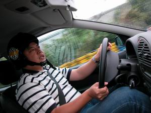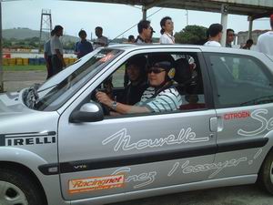 第二部試駕到的是Saxo VTS。Saxo雖然在房車賽中與眾多Civic競爭之下,成績只能算中等,但先天體質算是相當不錯。很明顯地,Saxo VTS的齒輪比很密,同樣乘坐三人外加錄影設備,出耶穌彎後必須進入三檔,退回二檔進入右髮夾彎。由於車體嬌小,Saxo VTS的靈活度比Xsara VTR好多了,當然引擎馬力也比較大,1.6升120bhp的馬力確實蠻充沛的。可能是這部車的輪胎配得不錯(米其林Pilot SX),跑起來相當流暢,PIT後方直線尾的急左彎也非常輕鬆地點煞車後輪側滑入彎,根據錄影帶顯示,單圈成績大約在1分17秒左右,比Xsara VTR快上整整6秒!!