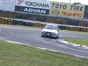無論如何,Xsara VTS是三劍客中的老大,2.0升167bhp的引擎大家垂涎已久,開起來至少會比VTR快許多吧!當下滑出PIT區,轉速拉高到紅線(耶!7000rpm喔!)進入二檔,前輪發出了打滑聲音後進入耶穌彎。大概是輪胎不行吧,在彎中以二檔前進都讓輪胎慘叫連連,看樣子成績好不到哪裡去。進入直線,加速力道比VTR好些,雖然齒輪比是一樣的,但還是能排入三檔,進入右轉髮夾彎,做個Heel & Toe(有點難做)哇!後輪還真滑!過了髮夾彎竟然車頭已經指向賽道中央,現在我知道為何有人會在耶穌彎撞牆,有人會採茶三次了!不過從另一個角度想,這種連手煞車都不用拉,就可以甩尾的設定,在TIS中還真是受用呢!更有趣的是,入彎踩煞車時候輪會些微下沉,只收油門卻不會(因為是前輪驅動),因此收油門入彎更容易甩尾,踩煞車入彎反而不會,這或許是PSA車系受到普羅大眾歡迎的原因,大多數人進彎會踩煞車,很穩定,高手則收油入彎,恰好會有些甩尾。在本次測試過程中由於為了省下四條原廠MICHELIN Pilot SX新胎,換上耐磨型輪胎之後,這種特性更明顯了,可能也是這個原因,使得其他媒體試駕時出了一些狀況。通過幾個S彎時,發現確實輪胎比原廠配的Pilot SX抓地力差許多,加強了PSS懸吊的特性,PIT後方直線同樣一口氣拉到紅線斷油,此時車速可以比Saxo VTS還快些,直接收油點煞車左彎,車尾迅速地往右方滑移,只要拿捏油門便可以掌握車頭的方向,確實相當聽話,不會在甩尾之後因為後軸強度不足而使車身左右扭動產生不穩定的現象。之後的幾個右轉ㄇ型複合彎道也很容易運用後輪滑移的特性掌控,但因為測試時搭配的輪胎抓地力差,過彎的速度應該沒有Saxo VTS快,使得單圈的成績僅在1分20秒左右。
