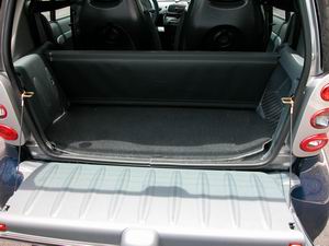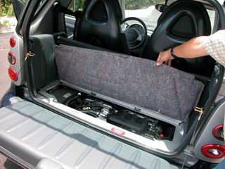 Smart連備胎空間也省下來了,把空間讓出來給引擎使用,後置引擎的設計,以一片金屬「引擎蓋」和隔板與位於其上的行李箱做區隔,實際上隔熱做得還不錯。後窗玻璃能夠獨立開啟,放下後擋門之後會有兩條鋼索讓擋門可以水平放置,原廠表示這個擋門可以承載大約100公斤的重量,標準身材的大人坐上去沒有問題(不過為什麼要這麼做?)。罕見的三孔輪圈在升級或換裝的時候可能會大傷腦筋,可選擇的式樣受限,輪胎尺碼特殊,價格上會貴許多,市面上常見的Brabus鋁圈一只叫價破萬!果然是賓士級的消費。